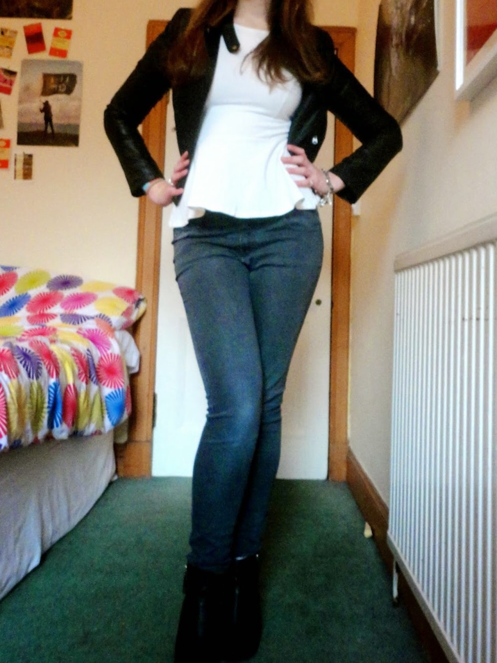 Muted, monochrome colours add a touch of elegance, paired with heeled booties & a leather jacket for edge