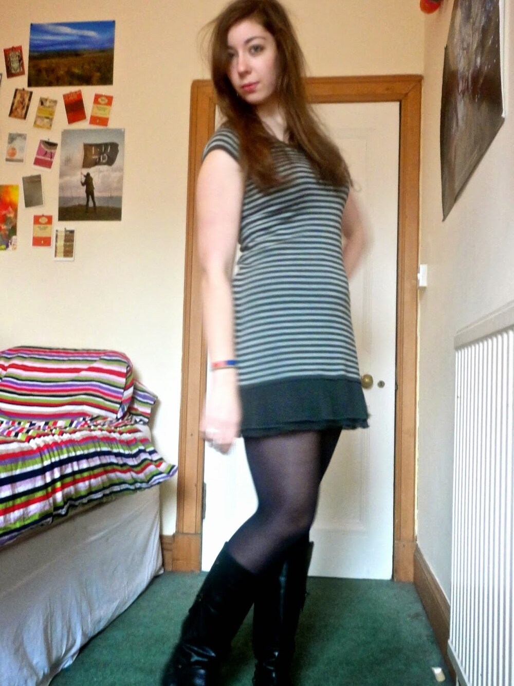 This dress is super easy to wear & style - tall boots accentuate legs, and stick to shades of black & grey for simple elegance.