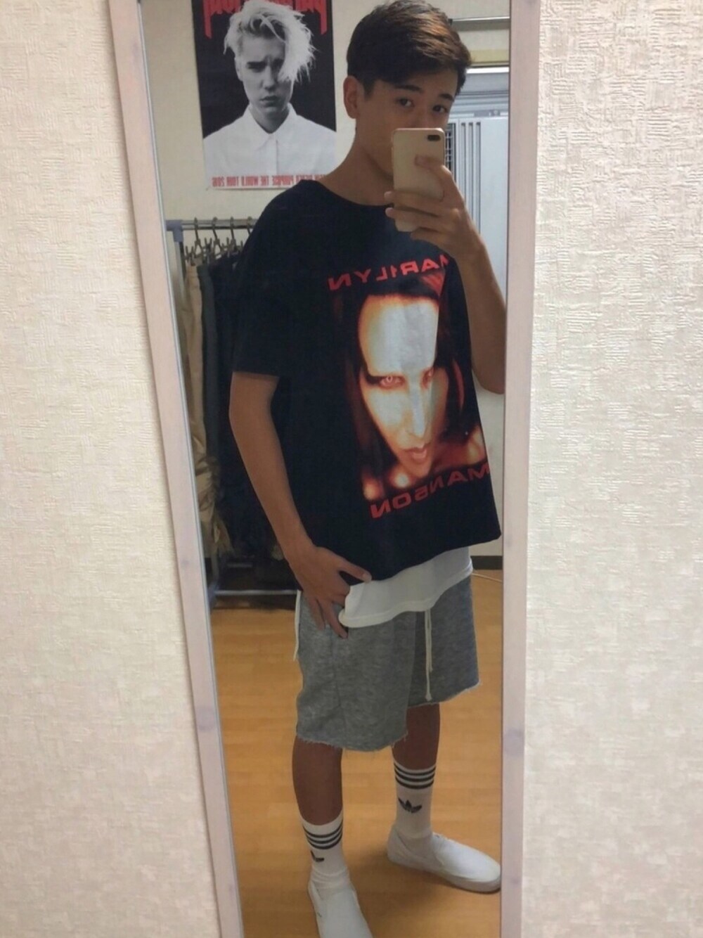 ジャスティンビーバーが着ていたpourpose×マリリンマンソンTを使ってコーデしてみました。いいね、フォローお願いしますぅ。