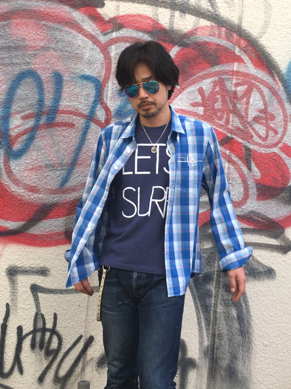 Tシャツとチェックシャツの 春先にオススメのスタイリング。 ネイビーTに、ブルーのチェックシャツ、 そして、ブルーミラーレンズのサングラス、 全て、ブルー系で合わせて、 統一感を出した拘りのスタイリングです。 juuni.jp