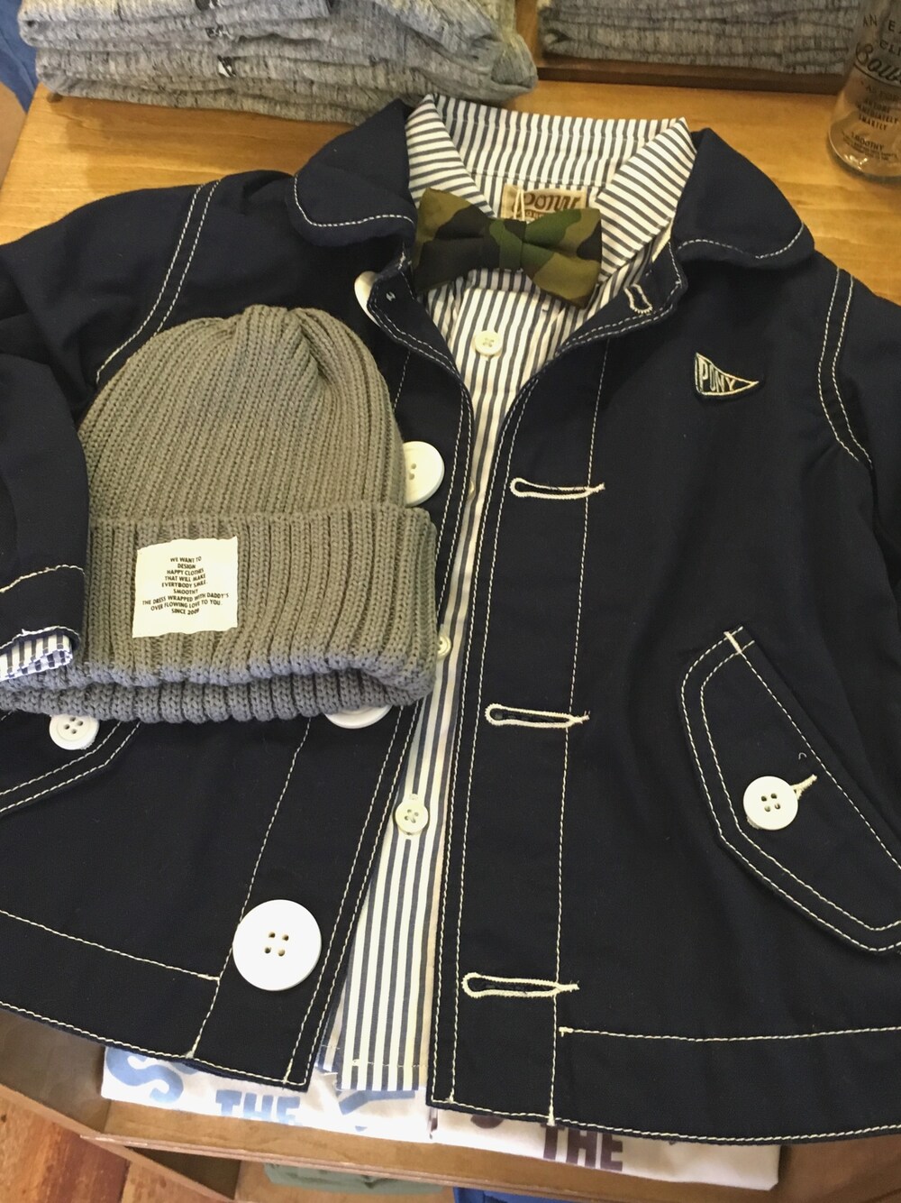 春アウターの本命、カバーオール! 丸襟と、大きな白ボタンが特徴です。