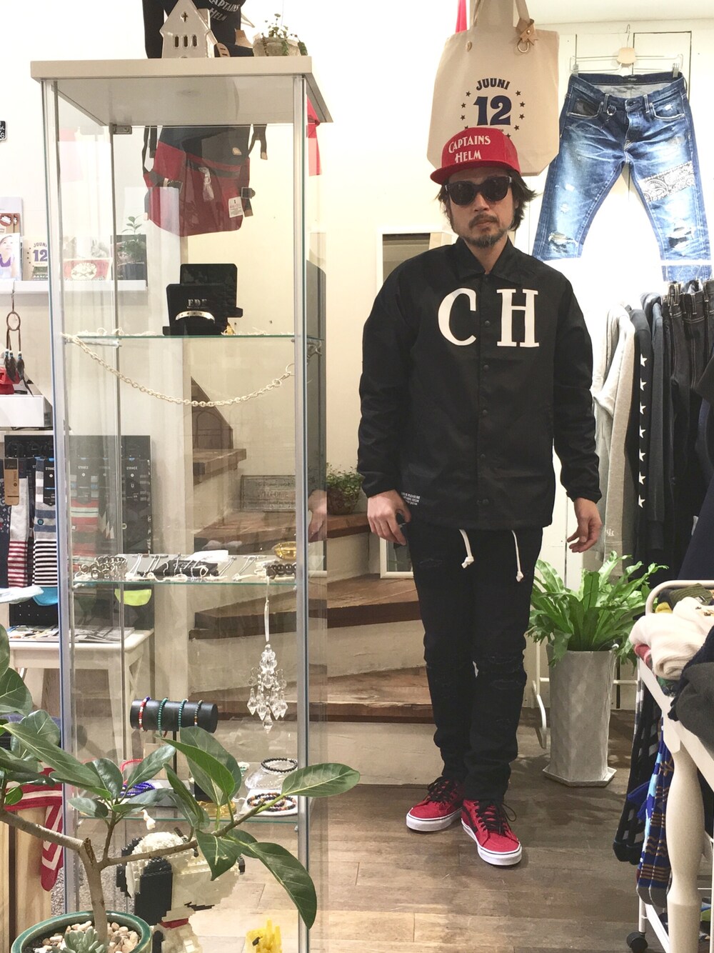 OVERDESIGN新作ブラックスキニーに、 一推しのコーチJKTを合わせて… 上下黒で重くならないよう、キャップとスニーカーを、パキっ赤で黒赤の統一感を出しました。