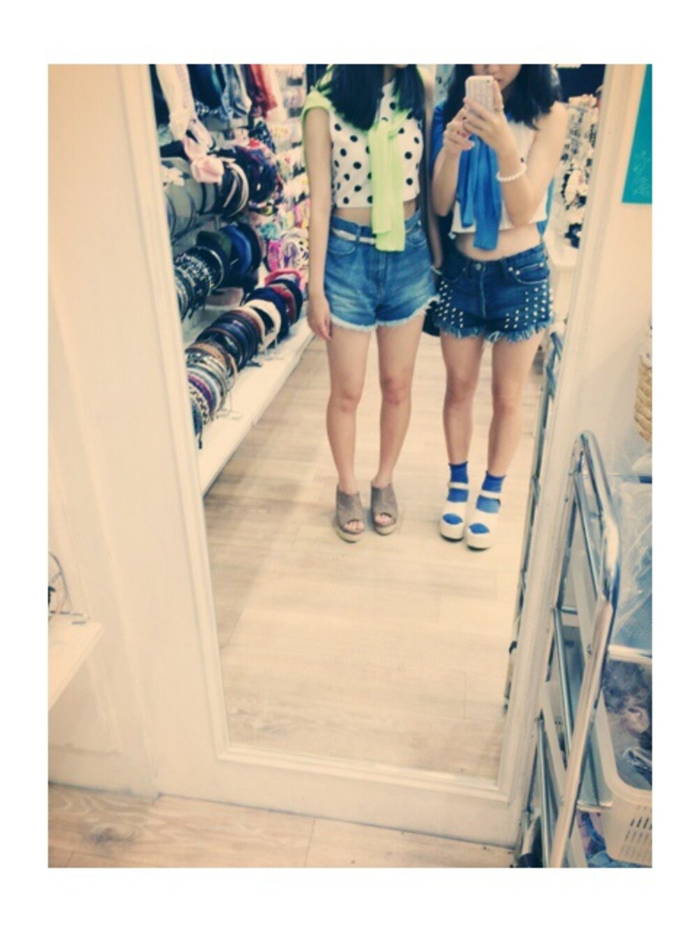 白のミニタンクにショートパンツ、青の靴下に青のカーディガン、白の厚底サンダル オソロコーデ