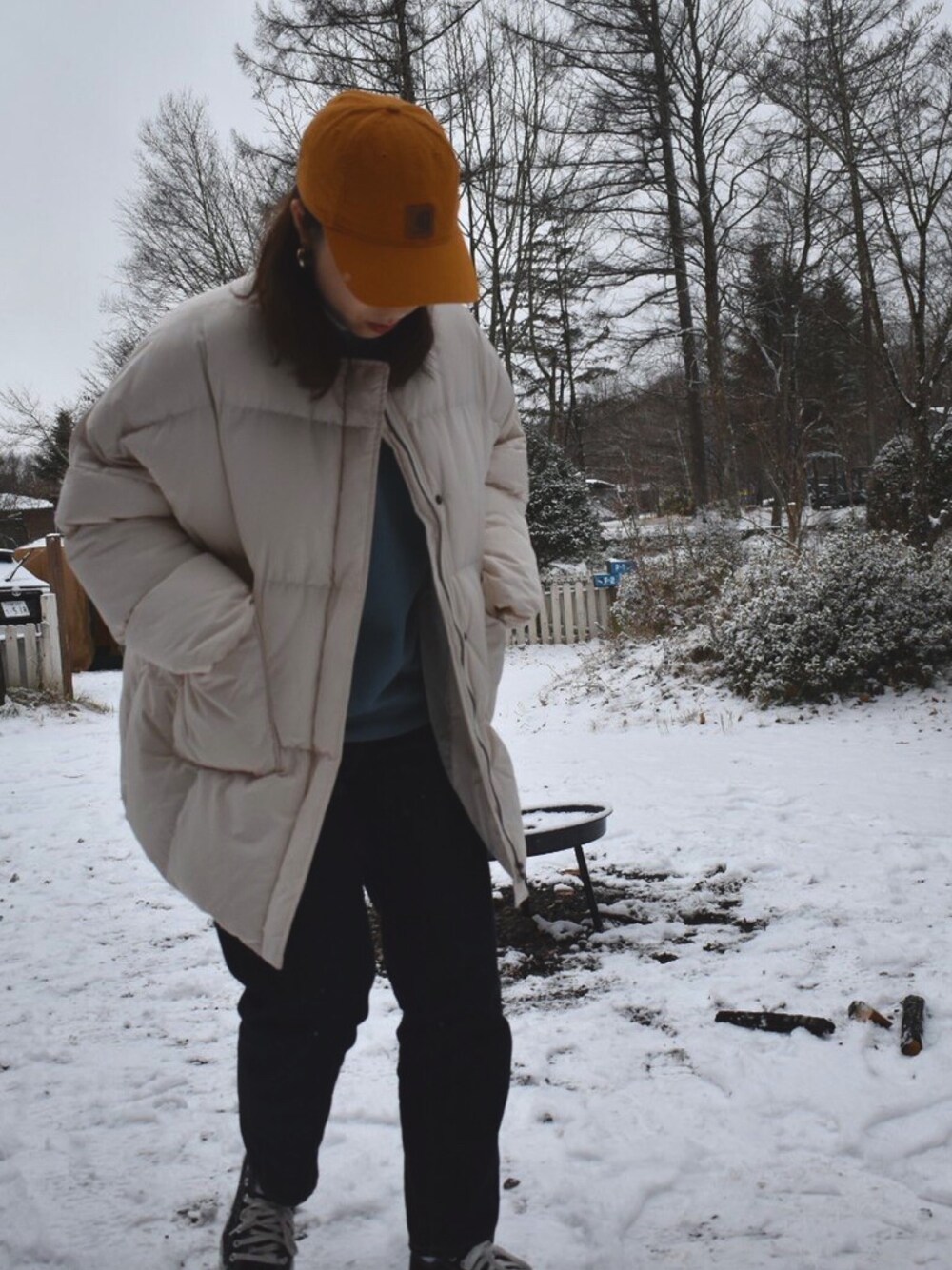 コテージキャンプに行きました! 長野めちゃくちゃ寒くて夜のうちに雪になってました😂軽く雪合戦できました笑笑 寒いと聞いていたのでダウンを出してきました😊こちら古着屋さんで4500円!めちゃくちゃ暖かくて着丈もやや長め、ノーカラーの丸首タイプのダウンでとっても可愛いです!買った当初はベイマックスって言われてました😂そのくらいオーバーサイズで可愛いのでとても気に入ってます😊