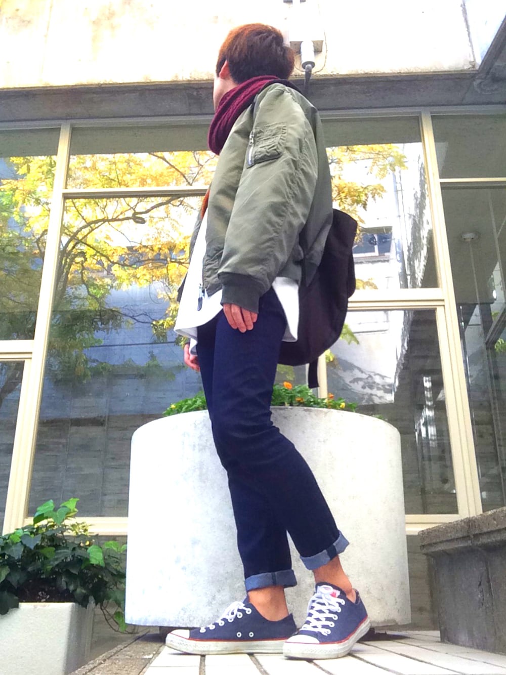 ビックシルエットのMA-1を使ったコーデ Yシルエットを心がけトップスもビックT パンツはスキニーデニムを履いて靴はコンバースのスニーカーを履き色の統一感を出しました。 それでは👋