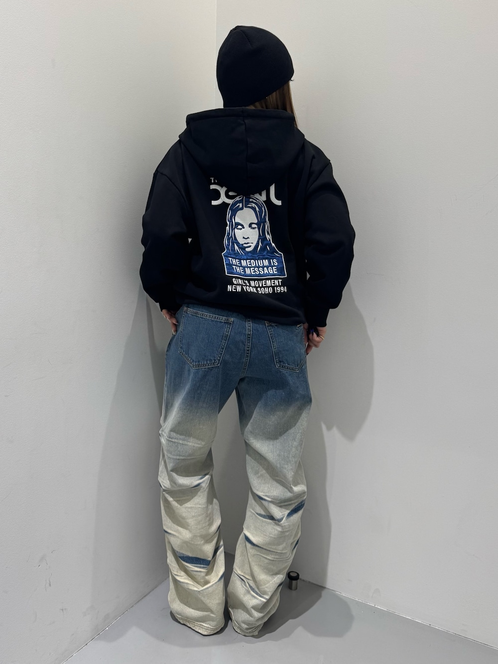📛着用サイズ📛 𝘁𝗼𝗽𝘀:One size 𝗽𝗮𝗿𝗸𝗲𝗿:M size 𝗯𝗼𝘁𝘁𝗼𝗺:S size パーカーは黒ボディにブルーが映える💙 ブルー部分はサテン生地なので光沢感あってロゴ目立ってかあいい🤭🩵ྀི パンツは裾に向かって色落ちしたグラデーション加工☆膝から下にタックが入っててデザイン性あるデニムで周りとかぶらなくてかあいい😌🩵ྀི ちょいとレングス長め!ウエストも緩め! いつもよりワンサイズ下げるのがオススメ☝🏼 ネットで売り切れていても、店頭に在庫置いてある場合もあるので、お気軽にお問い合わせください💌