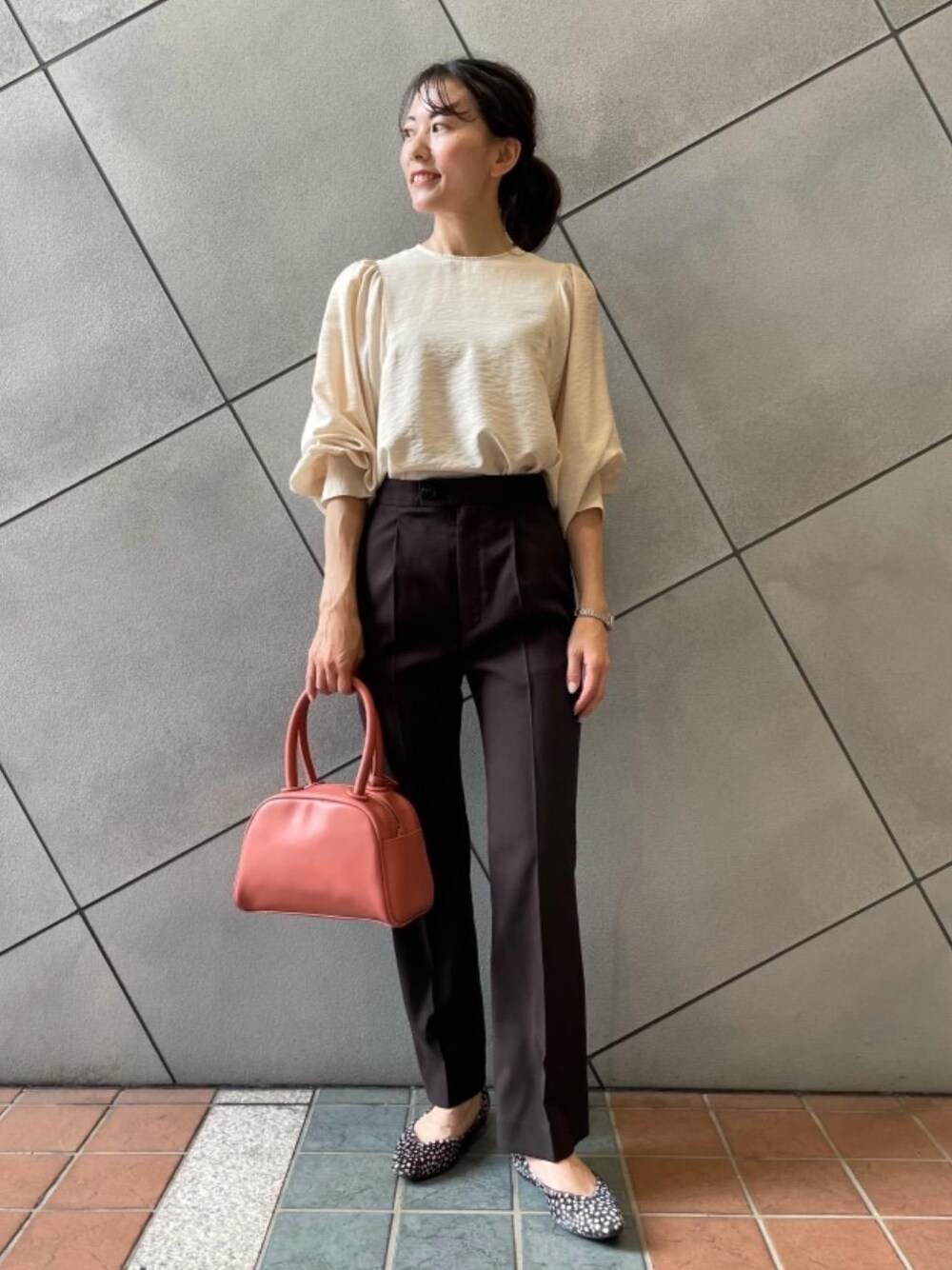 ●身長:153㎝ ●普段サイズ:ボトムス34 /シューズ 22.5㎝ 【サイズ感】 トップス:標準的 パンツ:やや大きめ シューズ:標準的 【コーディネートのポイント】 残暑の残る時期にも使いやすいスタイリングです。ブラウスは肩のボリュームが程よく、パンツ合わせでも上品な印象で着て頂けます。落ち着いたカラー同士だったので、バックはカラーものを合わせました。