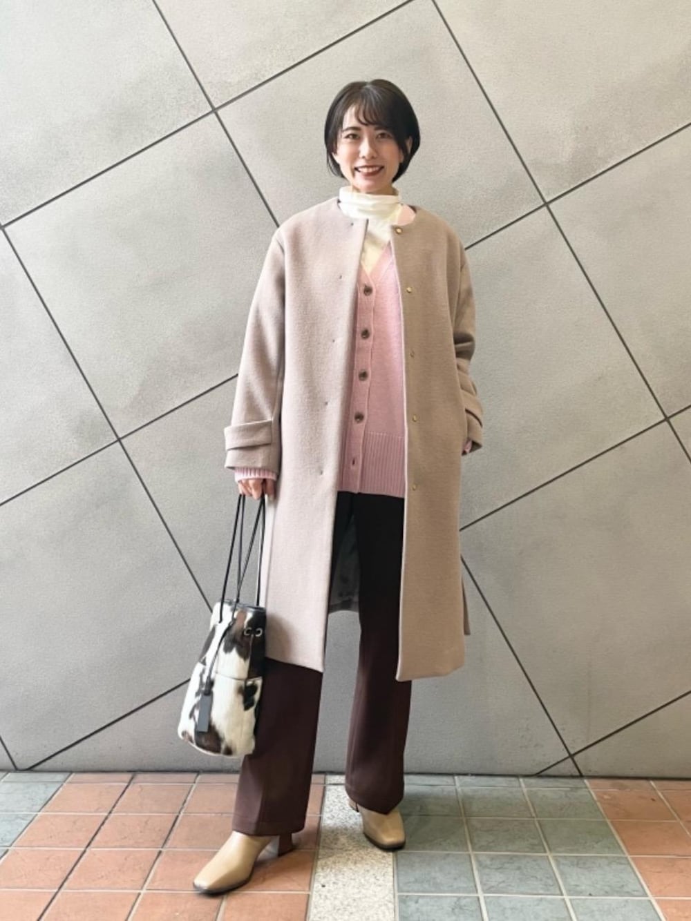 ●身長:153㎝ ●普段サイズ:ボトムス34 /シューズ 22.5㎝ 【サイズ感】 コート:ゆったり カーディガン:ゆったり カットソー:コンパクト パンツ:やや大きめ シューズ:標準的 【コーディネートのポイント】 ゆったりしたピンクのカーディガンにすっきりしたタートルのカットソーを入れてフレアパンツと合わせた女性らしいコーディネート! ピンクのカラーもブラウンと合わせるので甘くならずに着て頂けます。