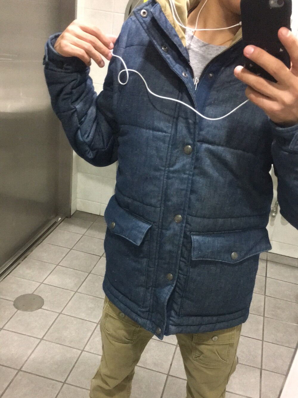 ブルー系のデニムジャケットを着用したメンズの秋コーディネートの1枚目の写真