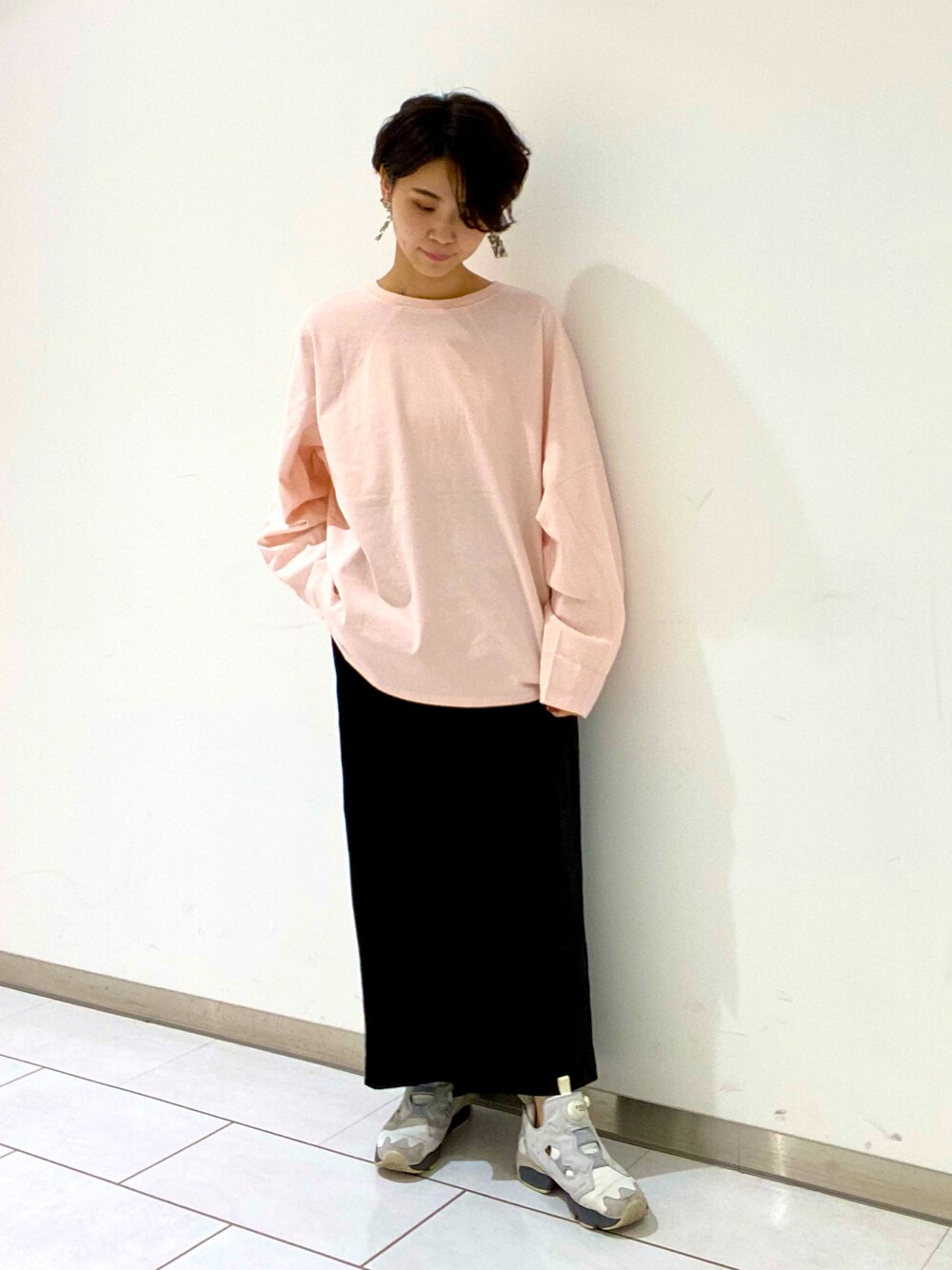 最近はピンクが気になります🐷 優しいピンクなのでカラーボトムと合わせるのもお勧めです◎ クリンクルベロアタイトスカートは伸縮性もあって 自転車にも余裕で乗れちゃいます😎🚲