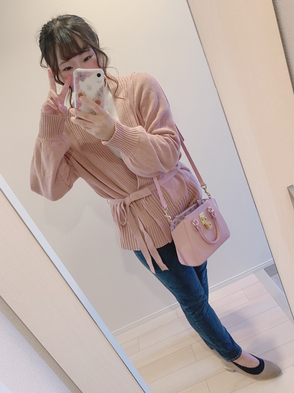 今日のコーデ❤︎ 珍しくパンツスタイル👖 マジェのお気に入りのカーディガンとの組み合わせ💓 デニムは何にでも合うから、 楽したい日には最高ですね😊✨ カバンはSamanthaのミニバック👜 ピンクでまとめたコーデでした💓