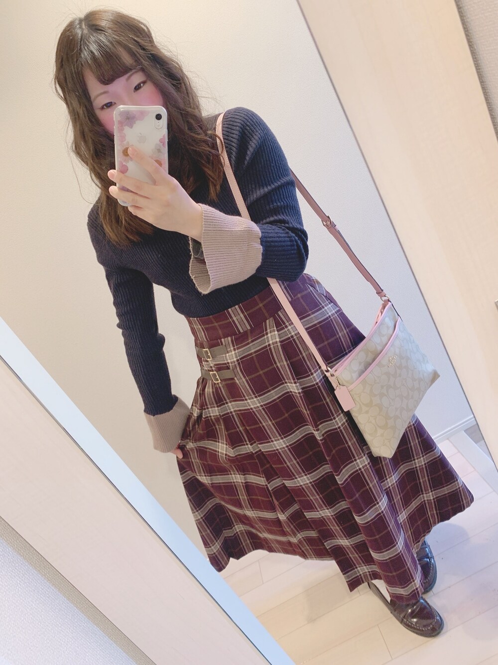今日のコーデ❤︎ 今日は落ち着いた色でまとめてみた❤️ Cherie Monaのニットに イングのチェックスカートの組み合わせ! 髪の毛もいい感じに巻けていい気分♩ (ちなみにストレートアイロンで巻いてます🤣) 今日はこれから友達とお出かけ♩
