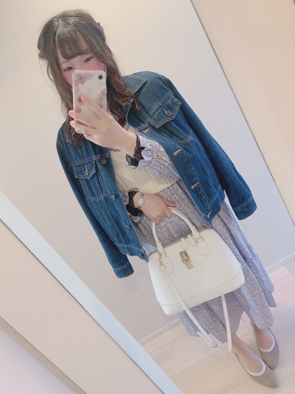 今日のコーデ❤︎ ⇩ 本日のテーマも春先取りコーデです☺️🌸 マジェのパープルカラー✖️花柄✖️ホワイトビスチェがセットになったワンピース💐💜 ワンピースだけだと全体的にボケちゃうから デニムでキュッと締めてみた! この前マジェで、春服たくさん買ったから これからも春コーデたくさんしたいなぁ💓🌸