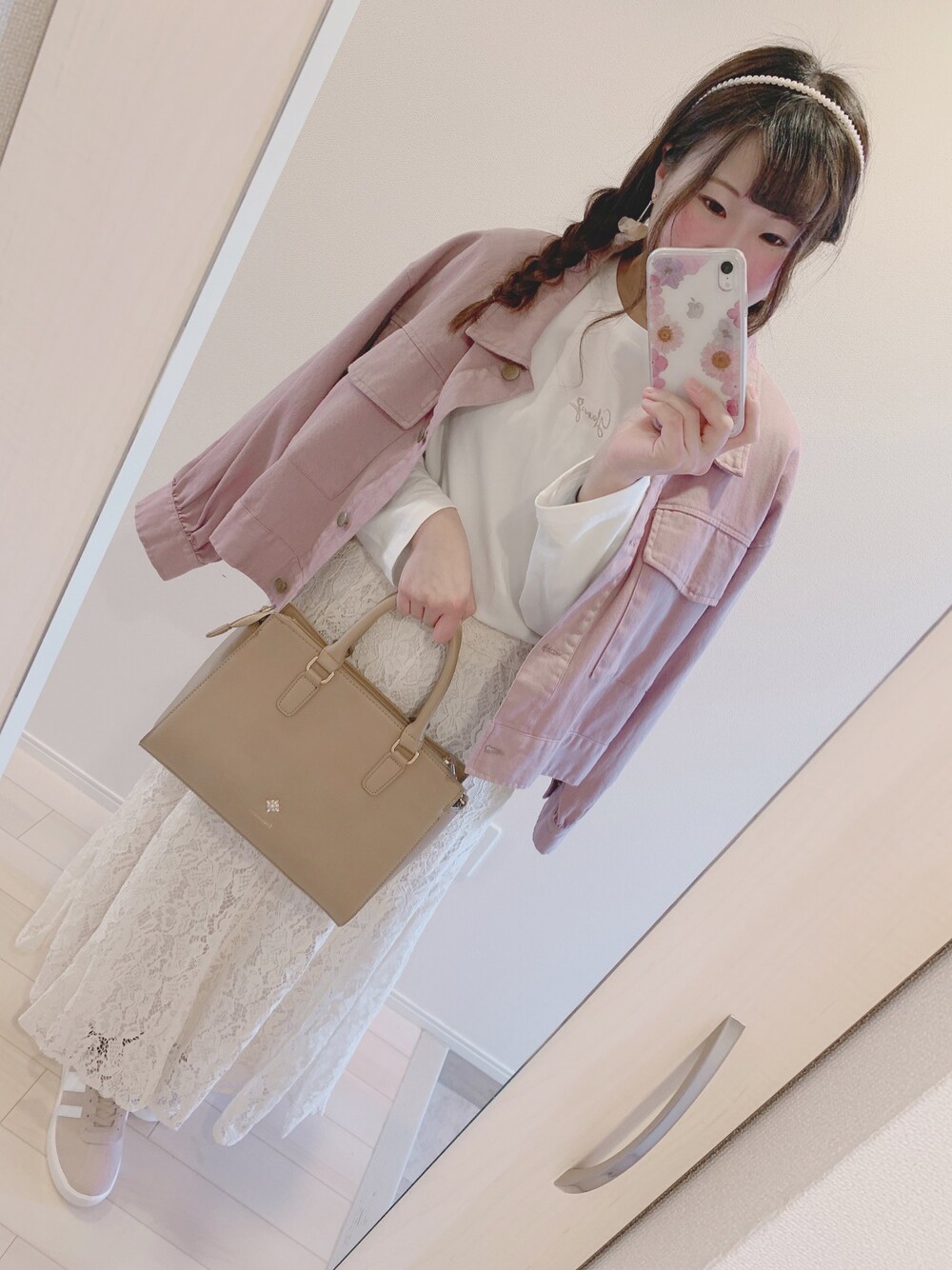 今日のコーデ❤︎ ⇩ 本日も春先取りコーデ🌸 今日はホワイト✖️ピンクの2色のカラーで組んでみまた🤍💗 マジェのシンプルTシャツは これからたくさん使えそうだし、 レーススカートもこれからの季節にぴったりのアイテム🥰 ピンクのお花のピアスもマジェ🌸 アウターは形もカラーに一目惚れして去年購入したもので 去年の暖かい時期はコロナで自粛期間だったから 外に出る機会なかったけど 今年はたくさん着たいなぁって思います🌸 GUのスニーカーは最近購入したもの👟 とっても軽くて履きやすい❣️ 自分の理想のコーデができて嬉しい❤︎❤︎ 今日はお休み!お友達とランチ行く🍝♩