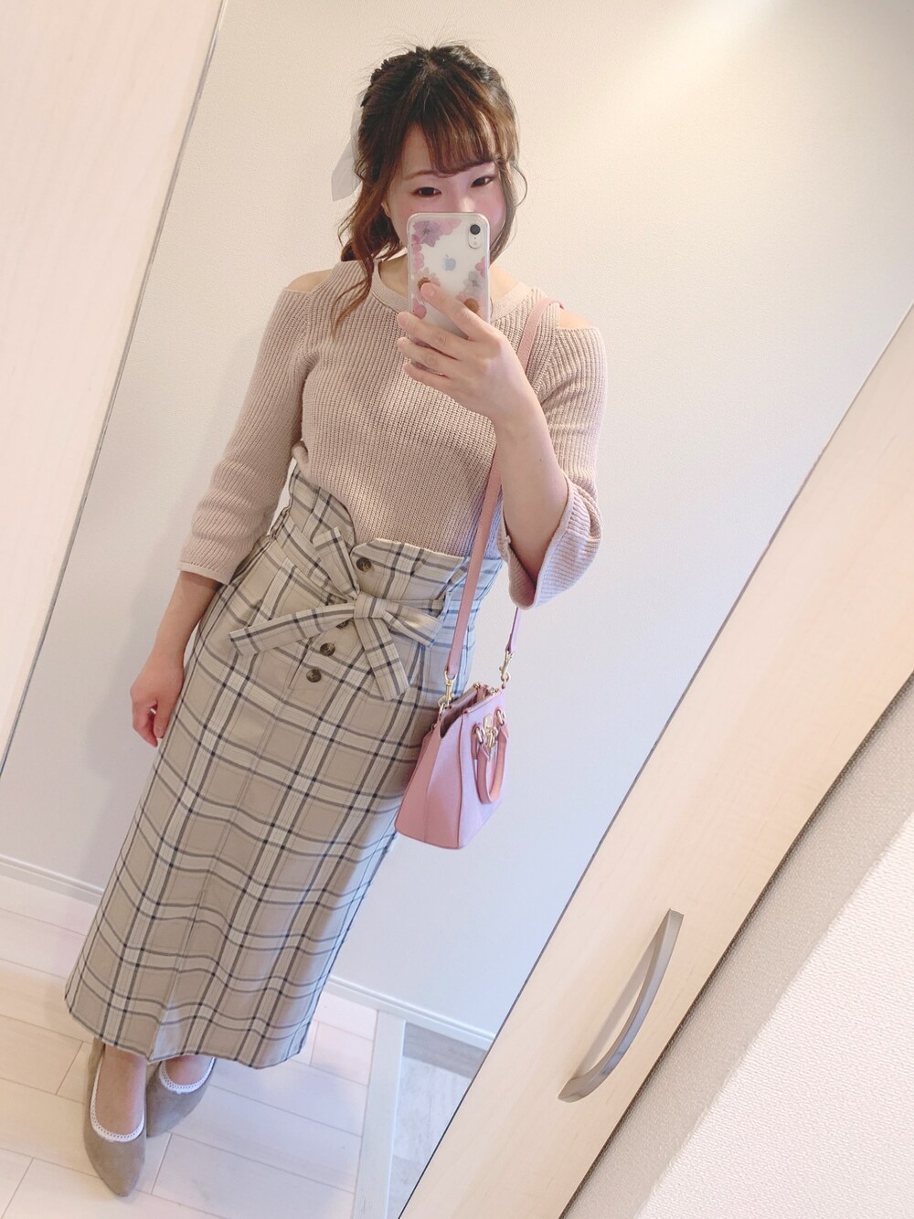 今日のコーデ❤︎ ⇩ ピンク×ベージュでまとめてみました💖🤎 何着るか全然決まらなくて悩んでたけど、 久しぶりにearthのスカートを履こうって思って それに合うトップスを組み合わせました🌷 このトップスは、もう何年も前に 竹下通りのお店で購入したものだから ブランドの名前も分からない😂 けど肩が空いてて、ちょっぴりセクシーなのが可愛くて好き☺️💞 バッグもサマンサのピンクにしました👜💖 これから車の点検です🚗💨