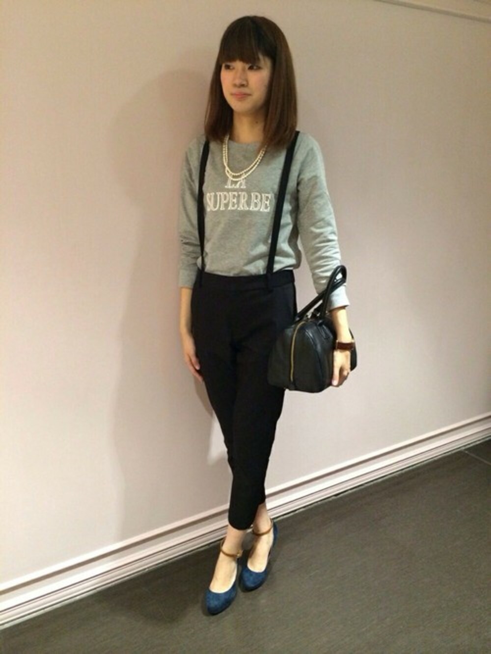 コンパクトなシルエットにサスペンダー付きのパンツを合わせたコーディネートです。サスペンダーは取り外しが可能なので、ON・OFFどちらでも使えます