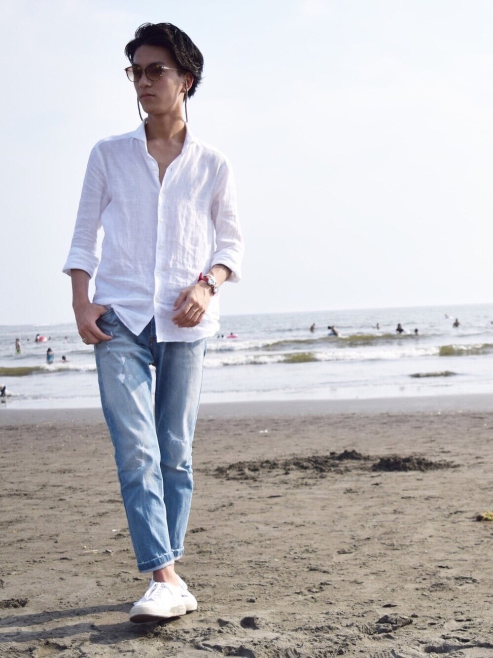 こないだ海行った時の🏖 海入る気ゼロでした🙃笑 ただ服装はリネンシャツに淡い色のデニムを穿いて白スニで爽やかに😑 最近楽しいこと続きからの7連勤だからしんどい🌚