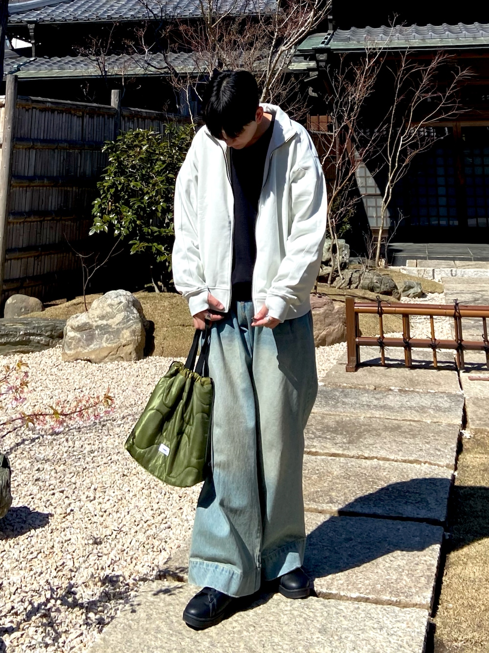 kojiのデニムパンツ「Wide Buggy Vintage Like Denim Pants / ワイドバギーヴィンテージライクデニムパンツ【泥加工 / ケミカルウォッシュ加工】」を使ったコーディネート