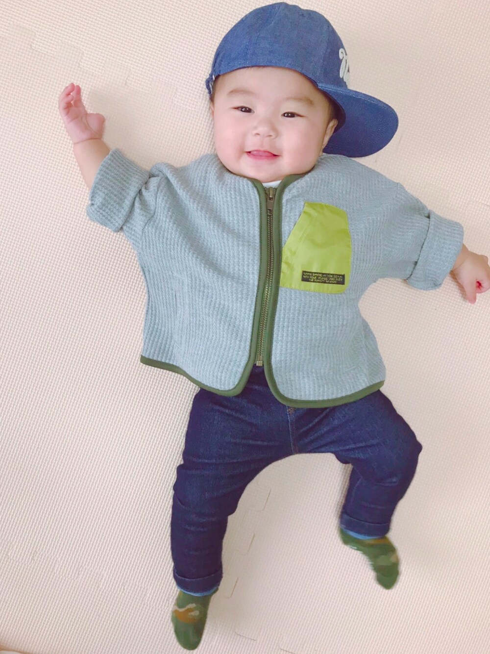 ワッフル素材のカーディガンがメインのコーデ✌️ どうして子供って靴下脱ぎたがるのでしょう🤣