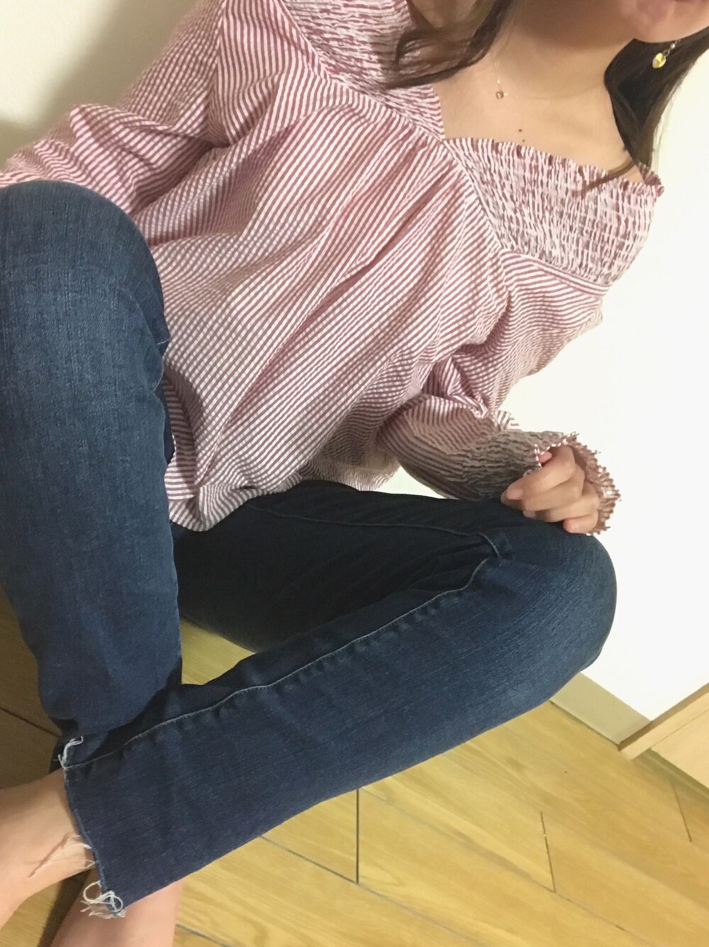 よよのシャツ/ブラウス「シャーリングオフショルダーブラウスプルオーバー」を使ったコーディネート