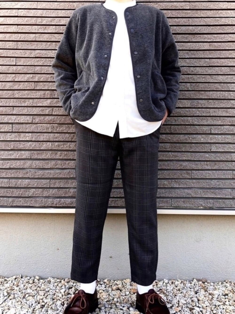 【プチプラ秋コーデ🍁】 近頃急に寒くなってきましたが、まだまだ寒暖差の激しいこの季節😭軽めのアウターを取り入れたプチプラ秋コーデです😄ぜひ、ご参考にしてみてください🙇♂️ 【コーデのポイント】 《全体》 ・メインのトップスとボトムスをグレー系の色味で統一して落ち着きのある大人きれいめカジュアルコーデに🍁🍁 《トップス》 ・今年流行りのノーカラーシャツで首もともすっきり小慣れ感UP✨ ・サイズもオーバーサイズで流行を取り入れ🧥 ・白シャツを取り入ることで、アウターとボトムスの色味の重さを解消+清潔感もUP📈 《アウター》 ・トップスのノーカラーに合わせてアウターもノーカラーで流行を意識✨ 《ボトムス》 ・今年流行のグレンチェックでシンプルコーデのアクセントに🎉 ・ウールライク素材でトップスとアウターのカジュアル感を緩和⭕️ ・パンツはくるぶし丈になるように丈詰めして、ぬけ感と小慣れ感UP⭐️ 《靴》 ・足もとのぬけ感に重みのあるチロリアンブーツでしっかり引き締め👞 ・ブラウンで秋感もUP🎉