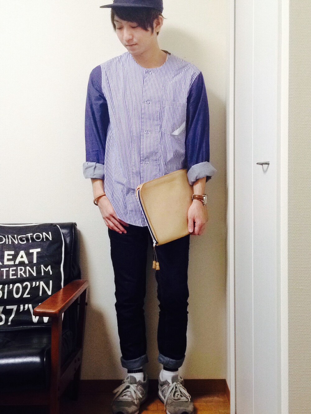 パジャマのようなベースボールシャツのようなオーバーサイズのお気に入りのシャツにいつものNBを合わせました 色も春らしいネイビーを基調としてカジュアルながらも少しきれいな感じに