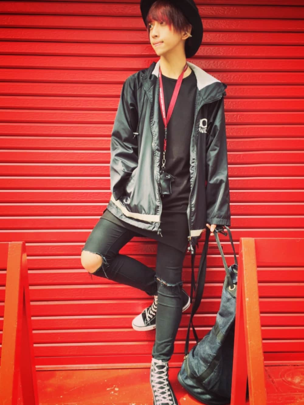 黒コーデに赤のストラップでアクセント。赤髪と合わせました〜 あした髪の毛切りに行きますーー