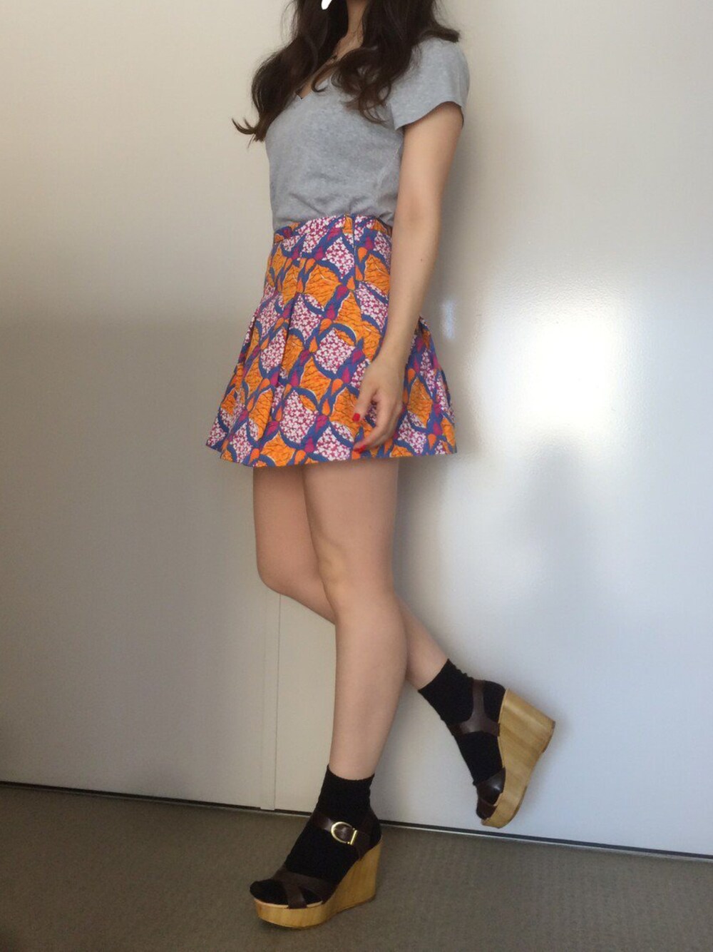 ハイウエストスカート大好き♡ スカートが派手なのでトップスはカジュアルダウンするため無地T 素足だと露出多いんで靴下履きました♡