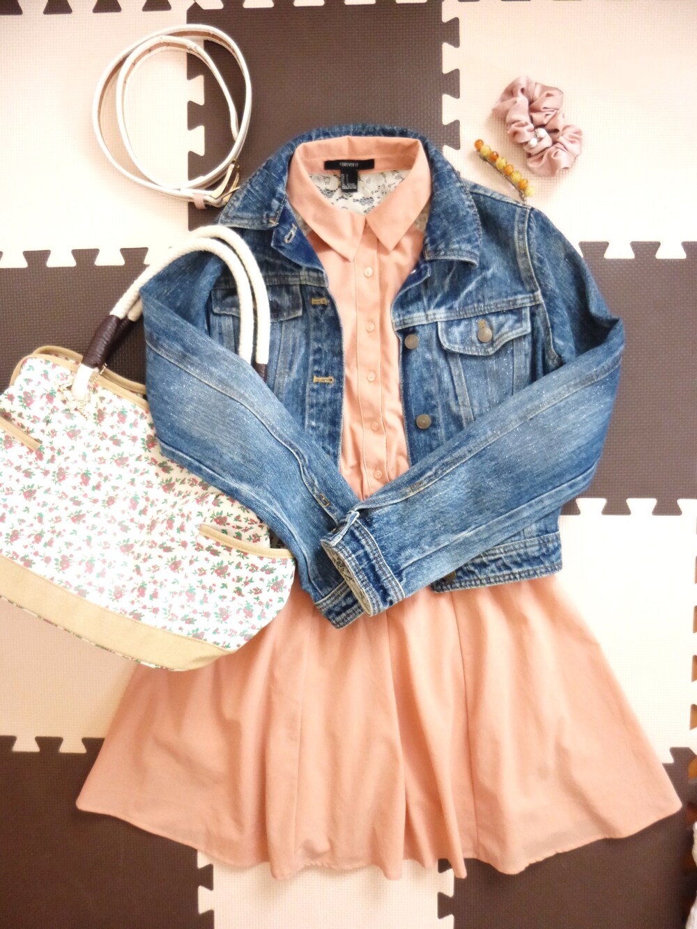 肩のところがレースになってて、Gジャンを脱ぐと、あらセクシー♡ 髪型はおろしてバレッタでとめてもよし、シュシュで結んでもよし♪ ウエストベルトで、細く見えるよ!!