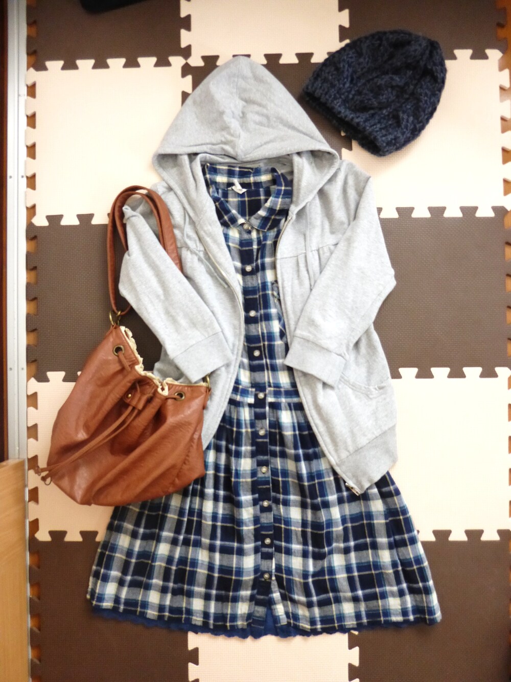 元気いっぱいコーデ! チェックのシャツワンピも薄いグレーのパーカーも、すごく着回しできる♪