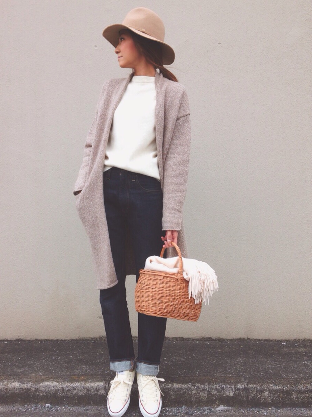 あさひと一緒に買ったカゴバッグ♡ あえて冬に持つのが可愛い♡ UNIQLOのトップスはメンズのS着用してます かなりオススメ♡ Instagram→ kayo.912