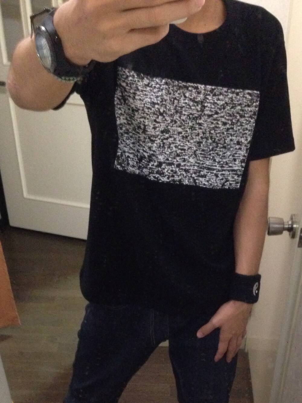 QRコードみたいな服 趣味のボルダリングで履く 伸縮性のあるデニムが お気に入りすぎて普段着でも履いてる 棚の奥にしまってあったリストバンド なんとなくつけてみた LIVE行くみたいな格好で 講義うけてきやす