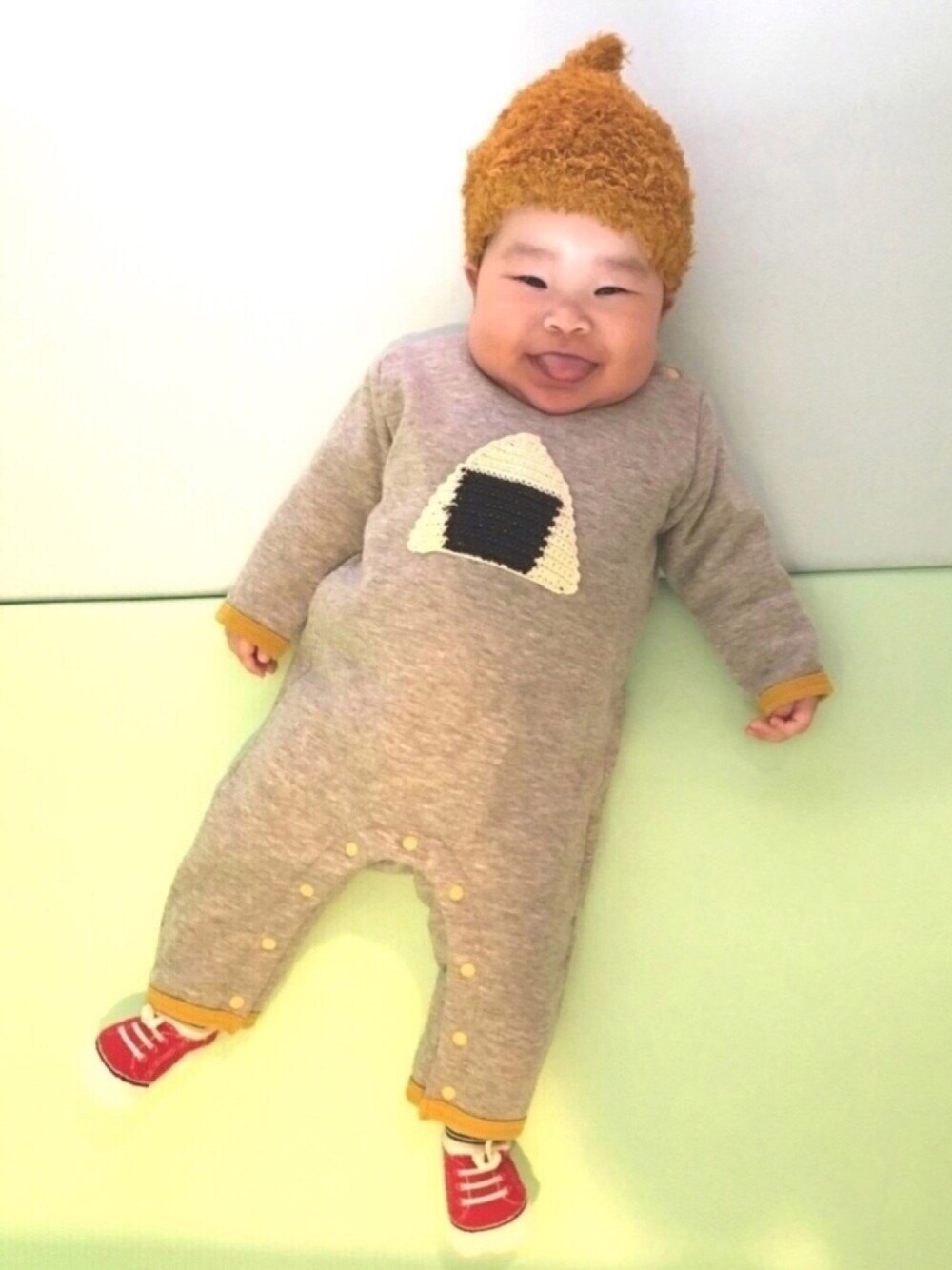🍙本日はおにぎりロンパース🍙 以前このロンパースを着てた時に撮れた、奇跡の1枚…鼻ホジ写真…それを使って、今年のバレンタインはデコチョコにしました🍫タイミングが合わずまだジイジに渡せてないので、反応が楽しみです☺︎