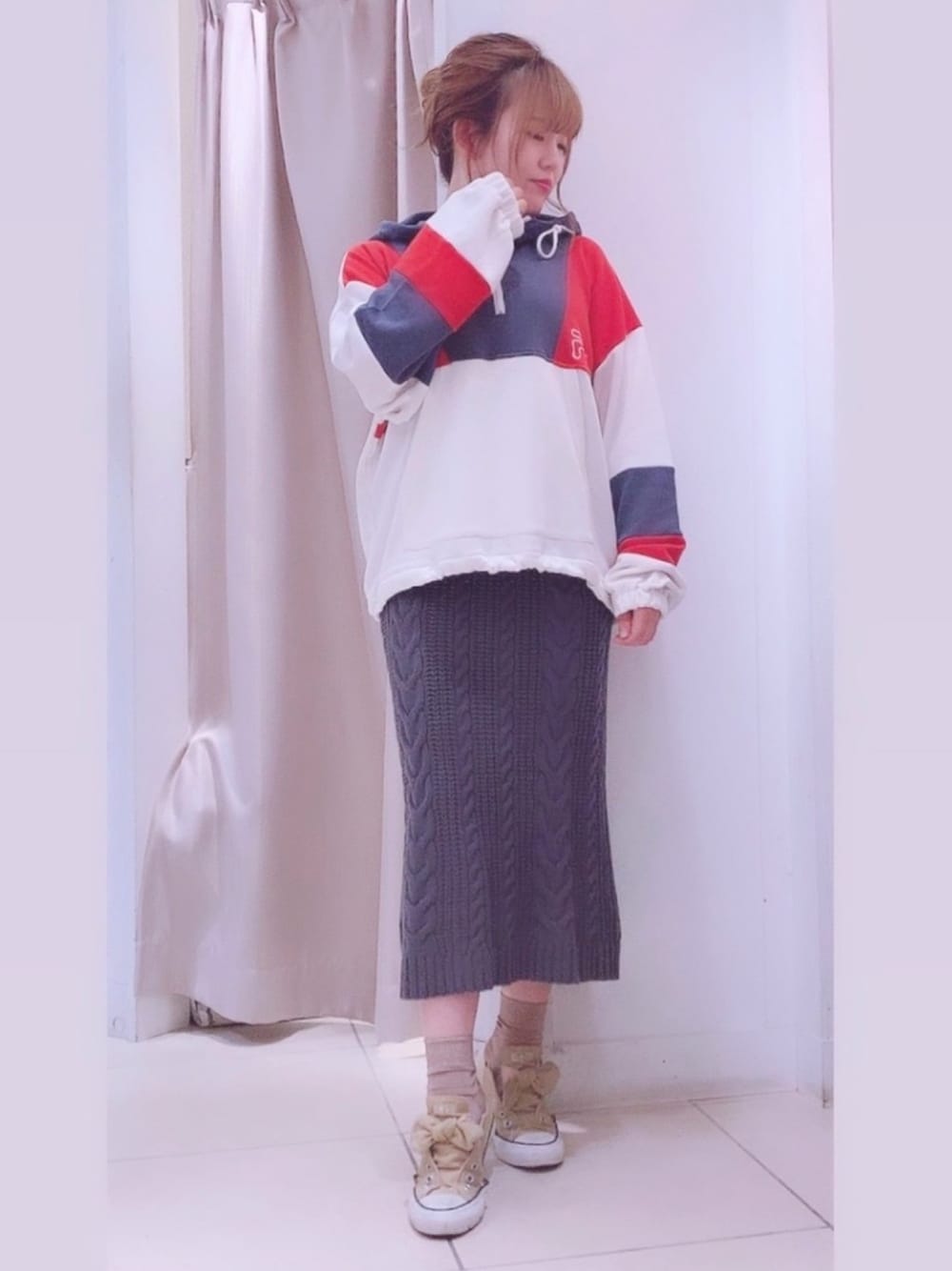 レディなスウェットコーデ🌹 FILAとのコラボはジェンダーレスなサイズ感なので カップルや親子でシミラールックにも🙆♀️ ニットのタイトスカートを合わせることで 女性らしいスウェットの着こなしに💕