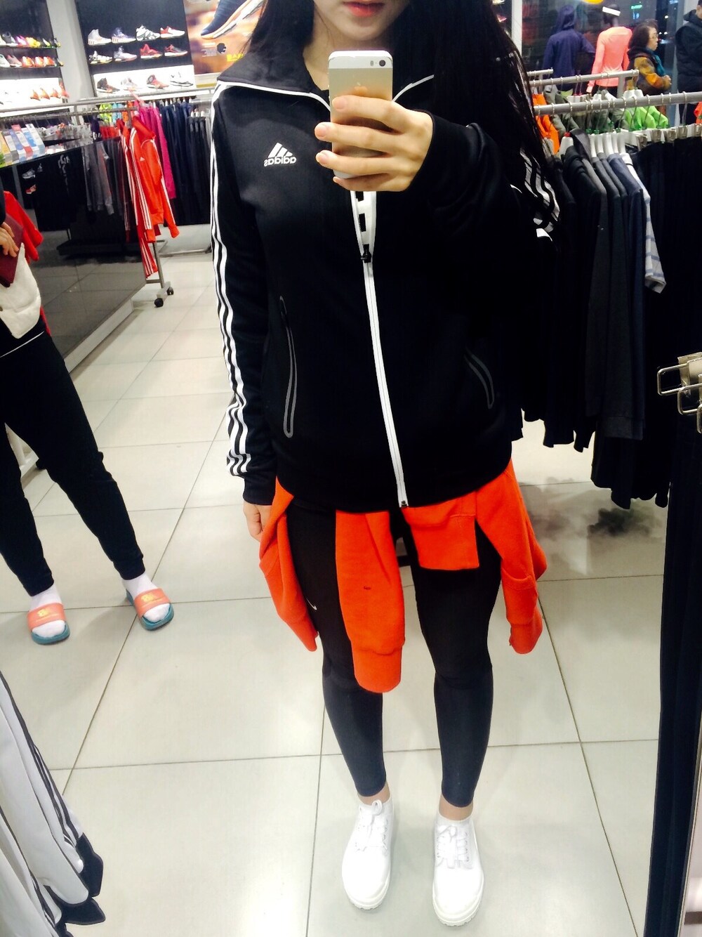 ブラック系のジャージ、ブラック系のレギンス/スパッツを着用したレディースの春コーディネートの1枚目の写真