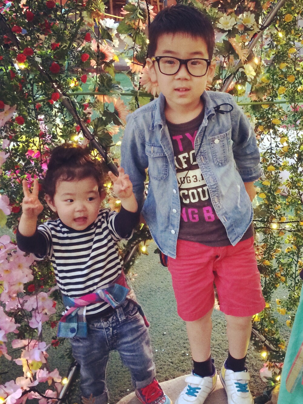 レッド系のシャツ/ブラウスを着用したキッズの春コーディネートの1枚目の写真