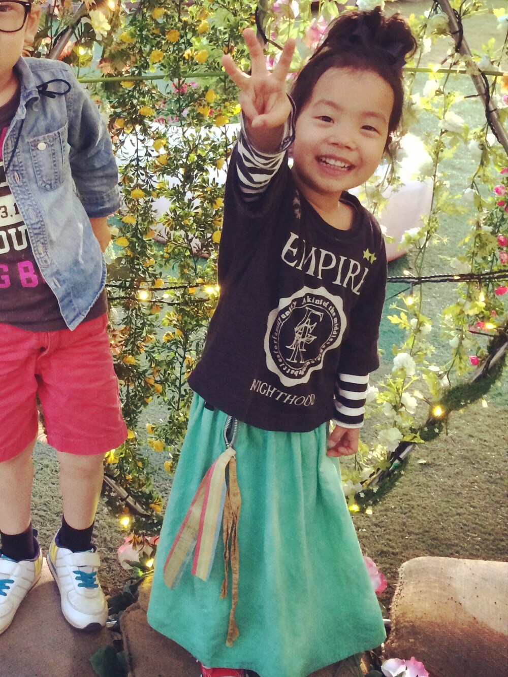 グリーン系のスカートを着用したキッズの春コーディネートの1枚目の写真