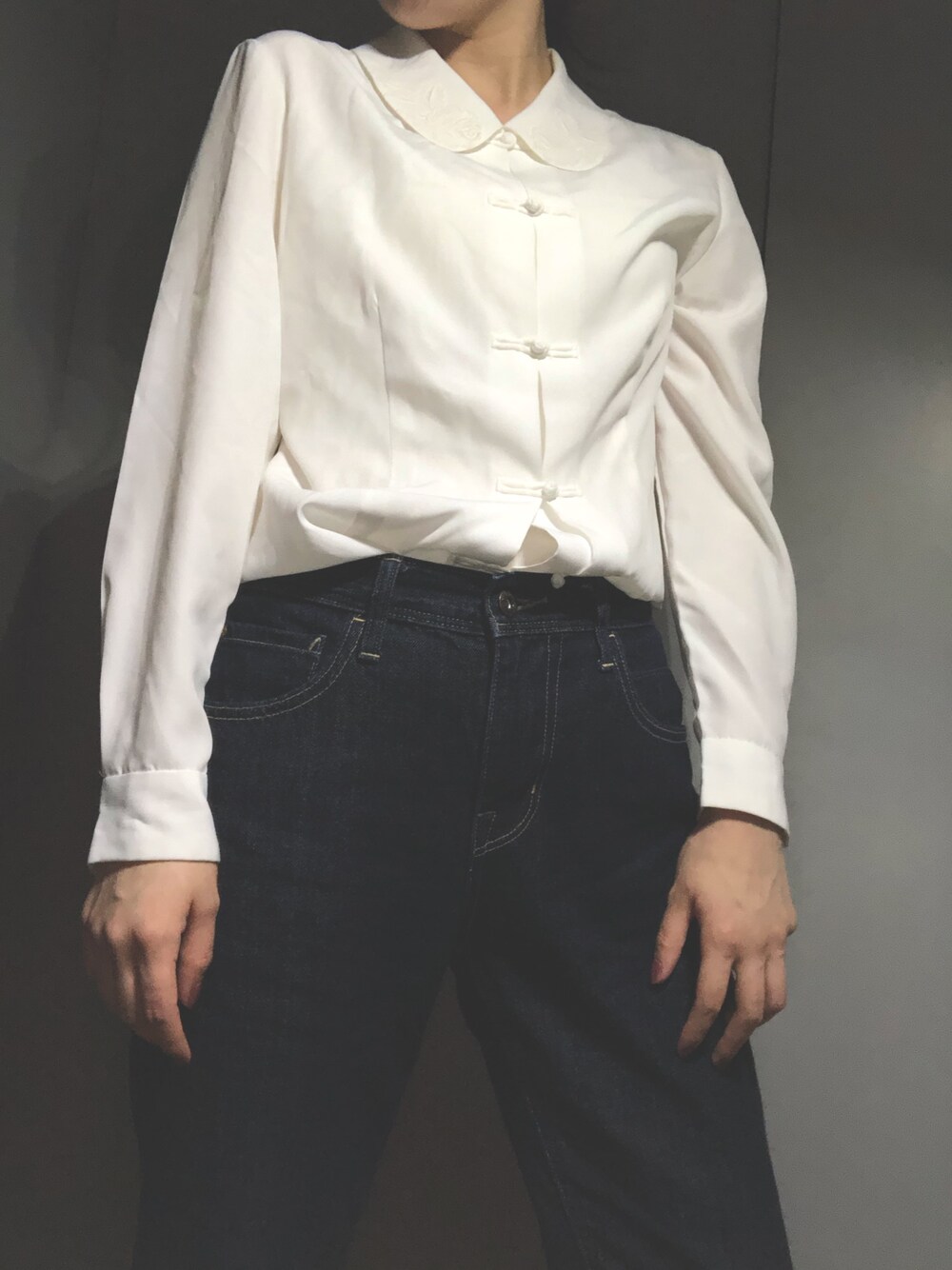 チャイナ風ブラウス×デニムパンツ 靴下はシアーブラックのドット柄でデニムからのぞかせてちょっとかわいくしました。 いつも通りトップスは母のおさがり チャイナ風のボタンと襟の刺繍レースがポイント