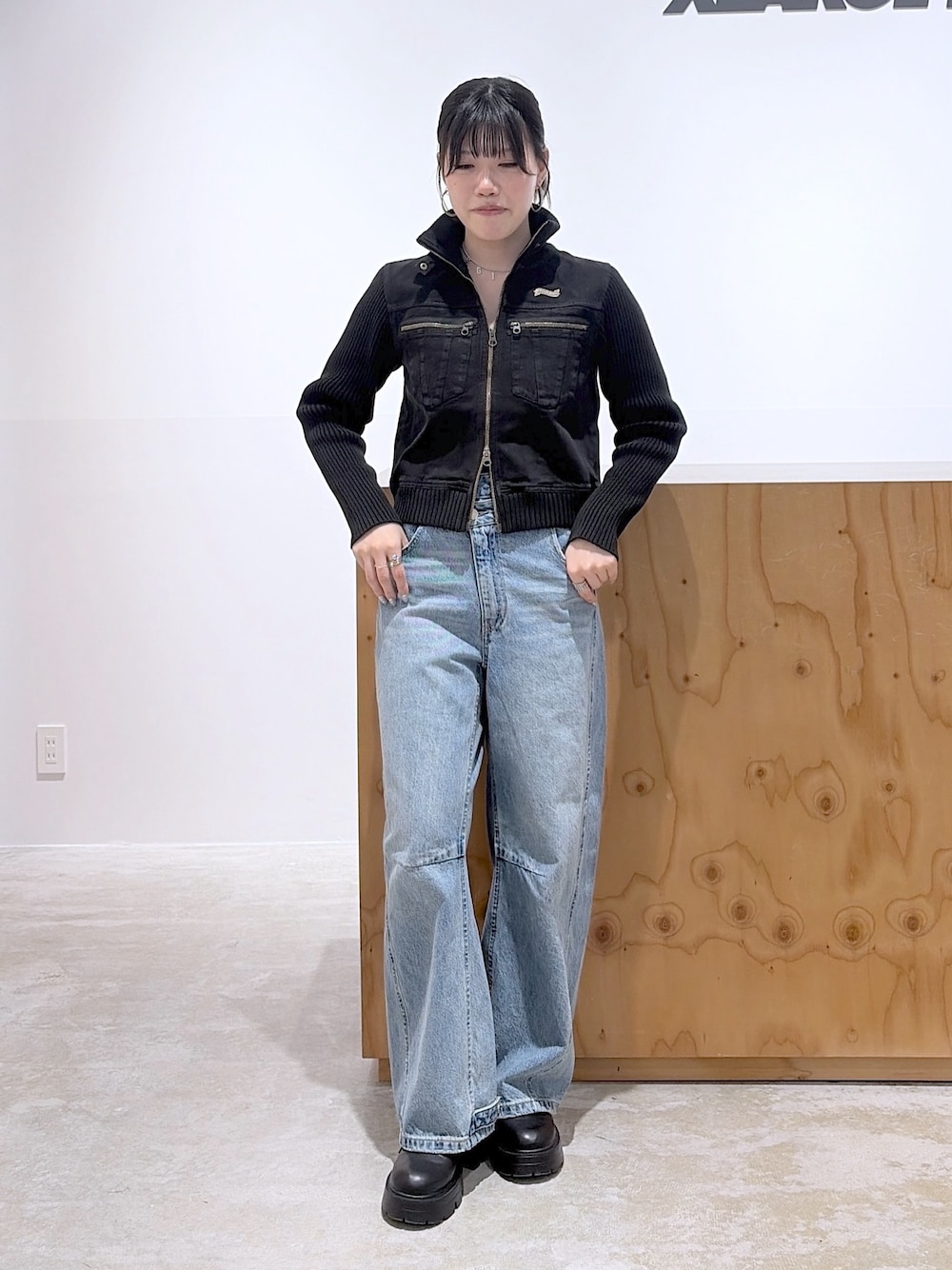 かもも(XLARGE/X-girl金沢(X-girl))のデニムパンツ「ASYMMETRIC WAIST BARREL LEG DENIM PANTS」を使ったコーディネート