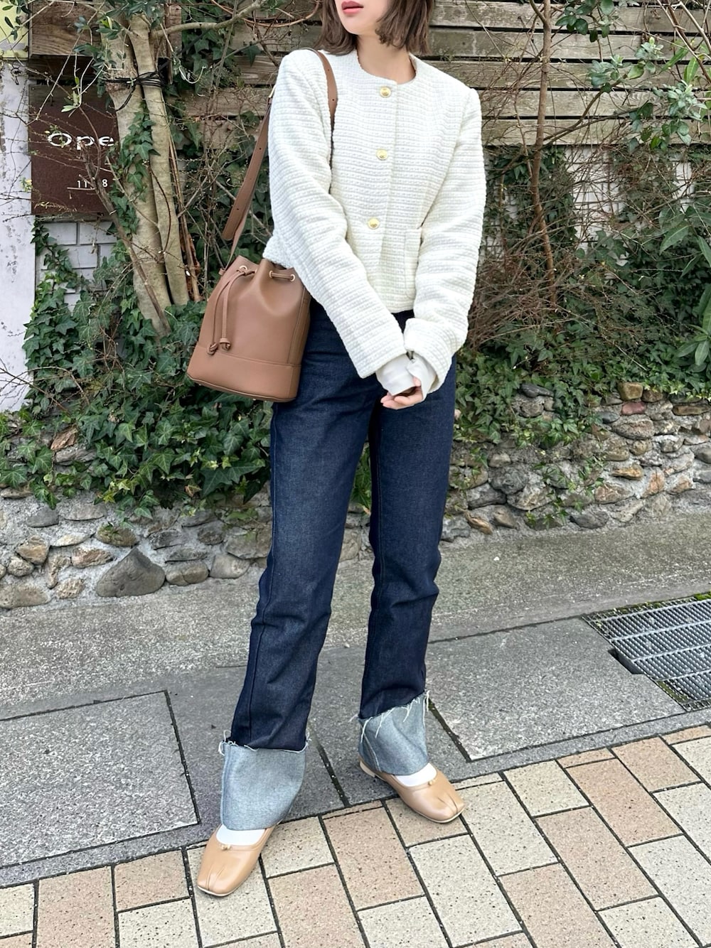 KASUMIのノーカラージャケット「金ボタンツイードジャケット」を使ったコーディネート
