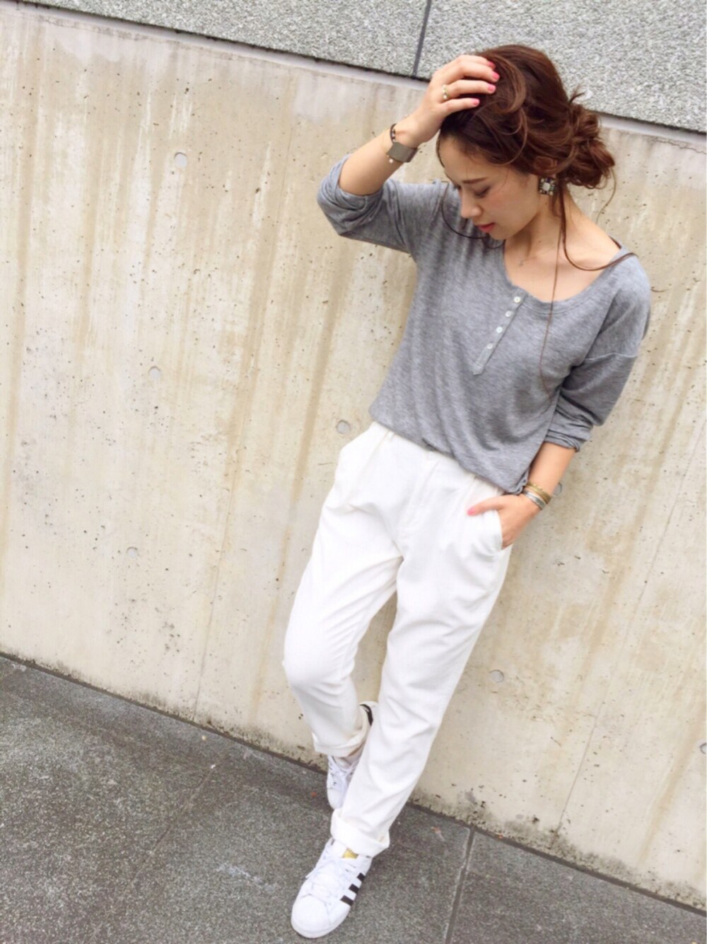 KASUMIのTシャツ/カットソー「【Casual】ヘンリーネックルーズロングスリーブTシャツ」を使ったコーディネート