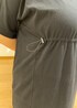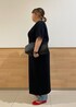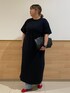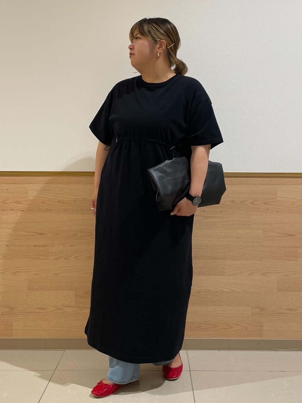 ウエストドロスト付Tワンピースにカービーデニムパンツをレイヤードしました。 ワンピース1枚着でも良いですがあえてレイヤードしてカジュアル見えしすぎない大人っぽさもプラスしました。 アクセントに赤のバレエシューズを合わせました。