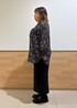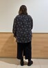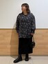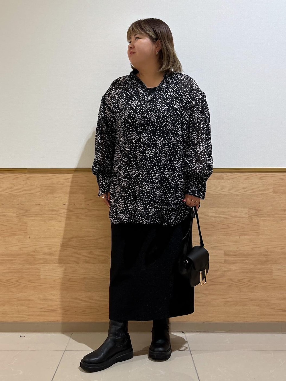 前後2wayシアー柄ブラウスでボタンを前にしてリボンは結ばずそのままたらして首まわりがすっきり見えるようにボタンあけて少し大人な感じでラメタイトスカートを合わせてます。 ワンカラーですがブラウスが柄のため重たくは見えないです。 ブーツは私物です。