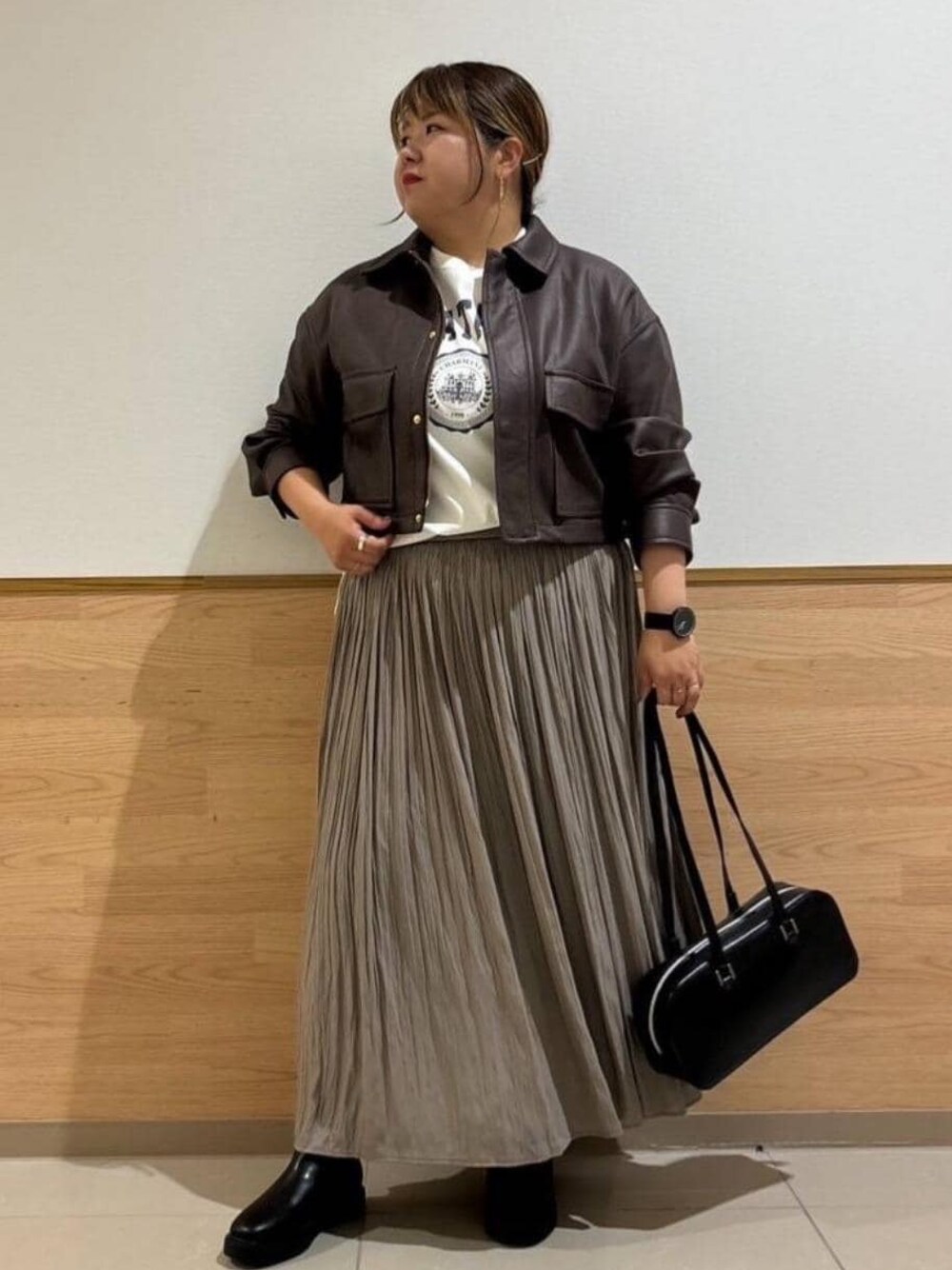 着丈が短めなブルゾンなのでプリーツスカートで動きが出るものを合わせました。 大人カジュアルでガレッジロゴオーバーTをインナーに合わせてます。 小物はブラックで統一してまとまるようにしました。