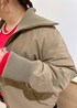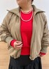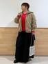 中わたスタンドカラーアウターにもちふわVネックニットのレッドを差し色で合わせました。 スカートがボリュームありますがアウターとの着丈バランスで重たく見えないです。 シルバーのメタリックバックで軽さを出しました。