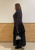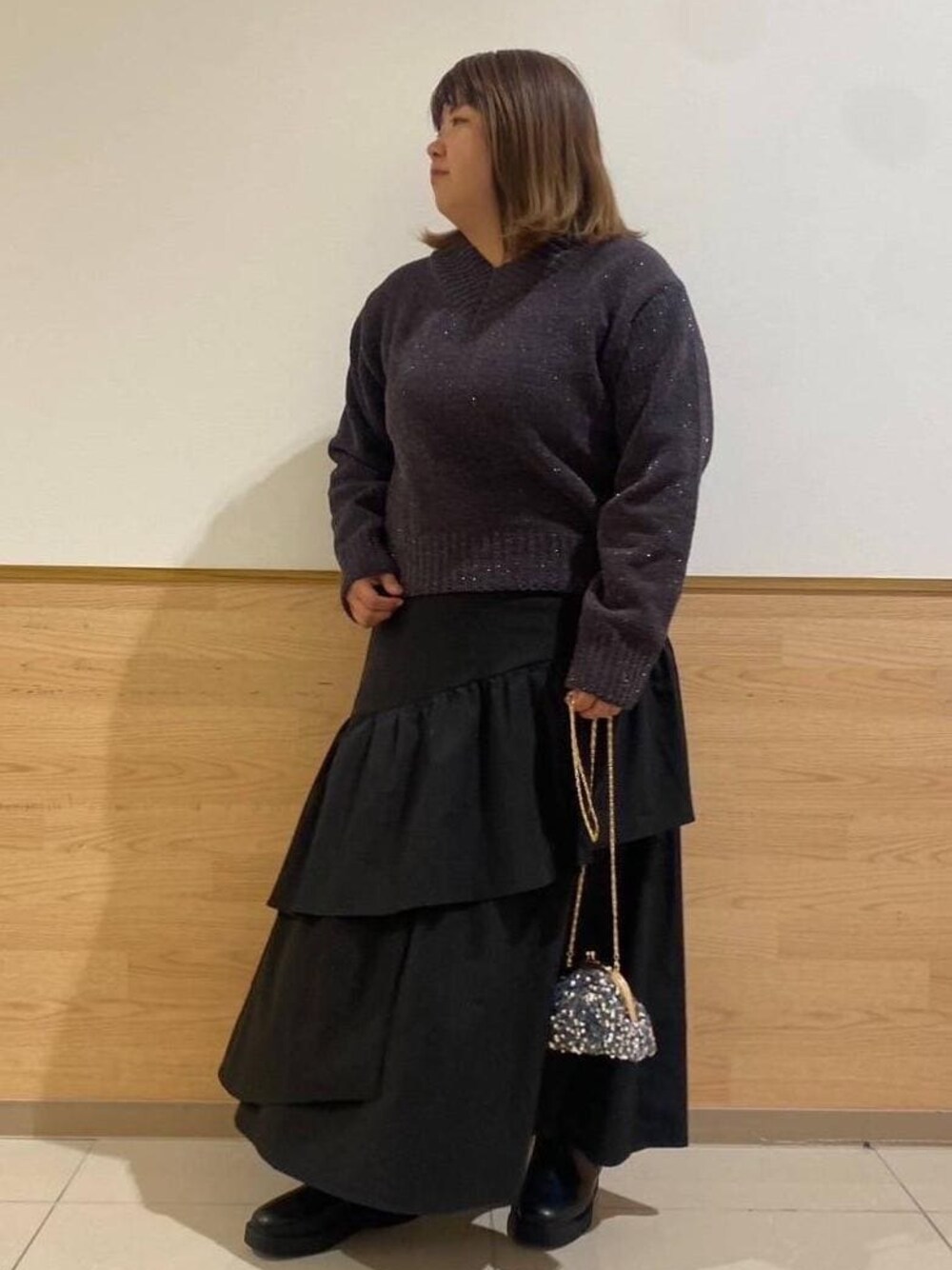 アンジェリーナニットがウエストぐらいの着丈のため スカートはボリューム感があるアイテムで合わせました。 シンプルですがラメ糸で華やかさもあります。 スパンコールミニバッグをアクセサリー感覚で合わせてます。