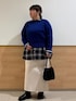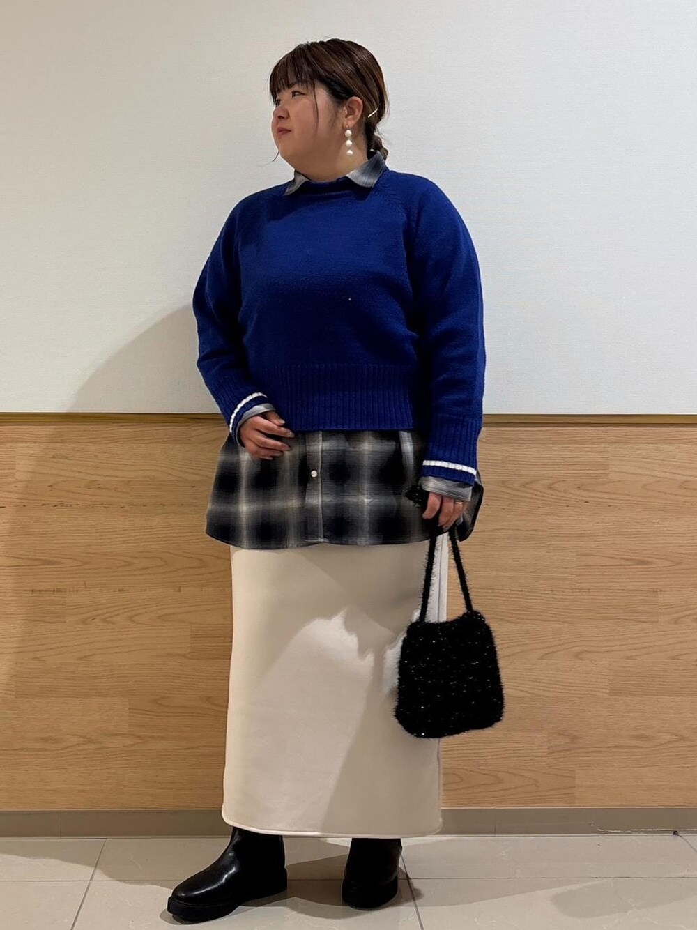 カラーニットの着丈がウエストぐらいのため オーバーシャツをレイヤードしアイラインスカートでバランス良く見えるよう合わせました。 小物はブラックで統一して大人カジュアルをイメージしました。