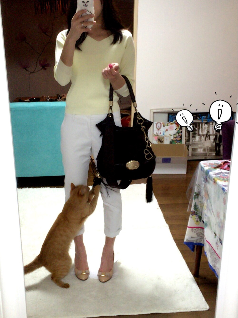 マイストラーダの黄色いニットを買って嬉しいコーデ♡ バッグのタッセルに猫がじゃれて…😭