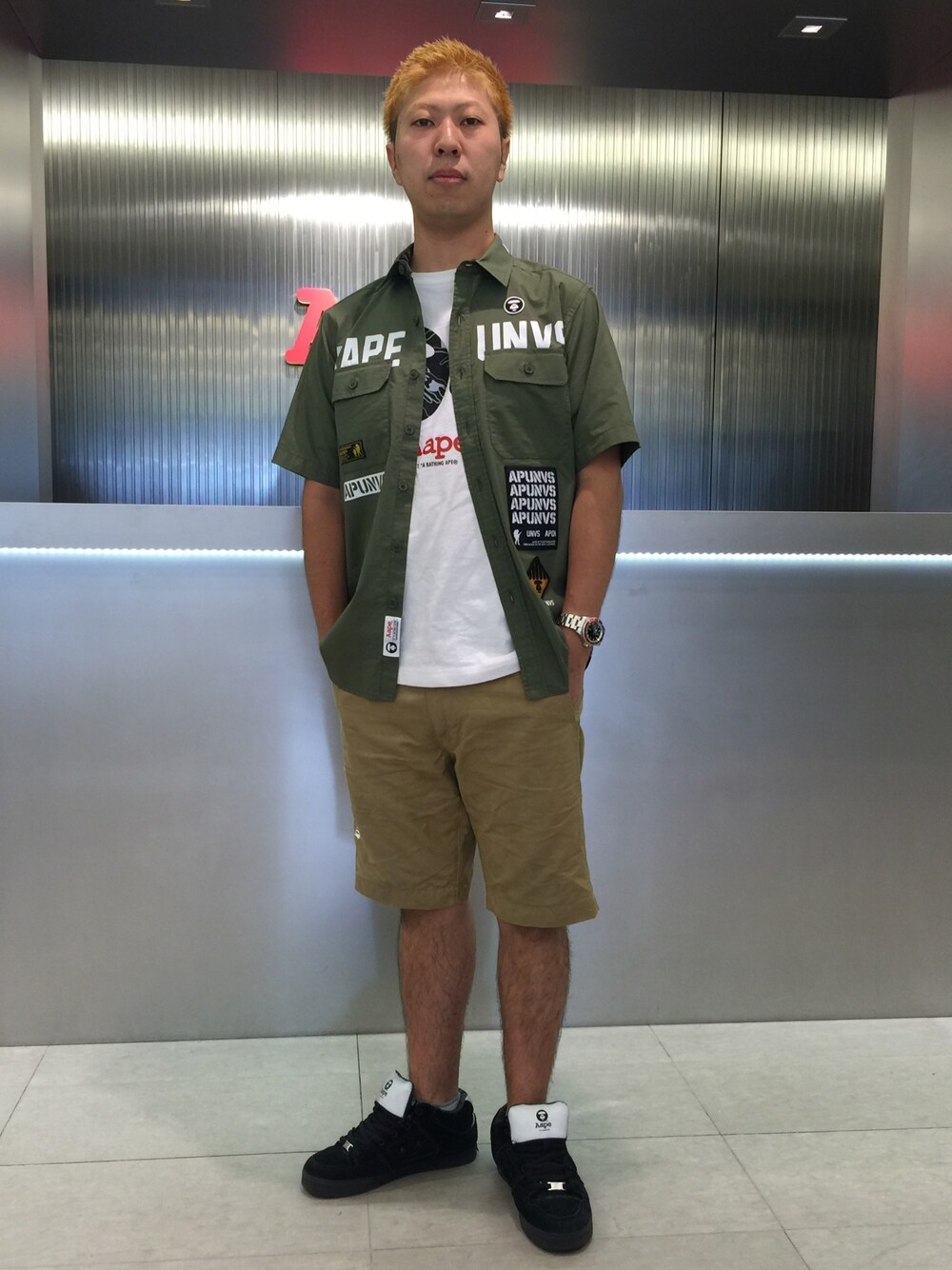 Aapeによるアイテムで夏のシンプルなコーディネートをしてみました。只今Aape storeでは4周年記念Tシャツが発売中です。オリジナルキャンドルとのセットになっておりますので是非店頭でご覧ください。