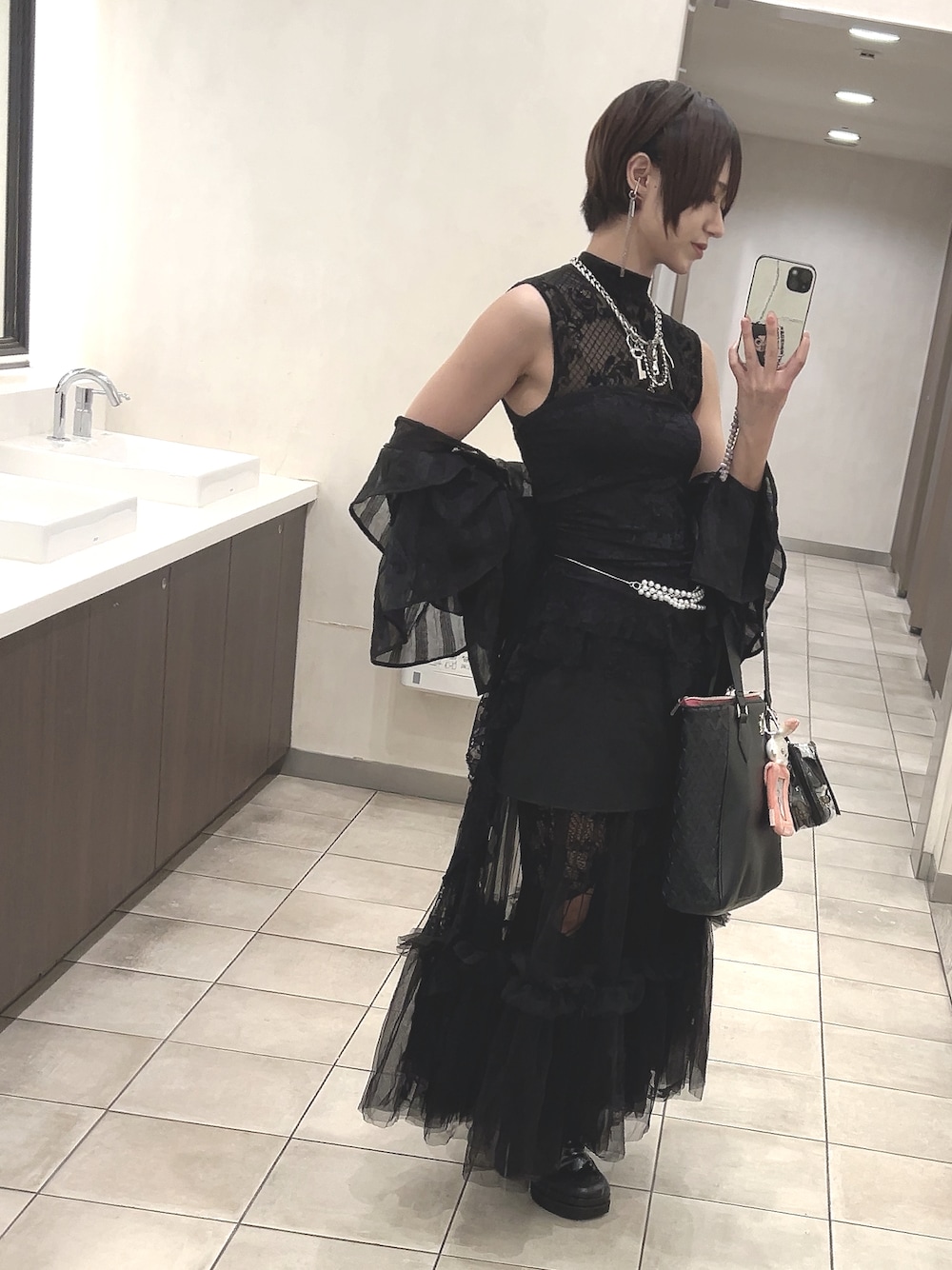 2枚目の後ろ向きの写真がお気に入りや〜〜〜〜 装飾品多すぎて毎回9個じゃ足りひんの笑う🤷♂️ オールブラックは裏切らへんわー🧜🏼♂️ 最高🙂↕️また着たいコーデ🫶🫶🫶
